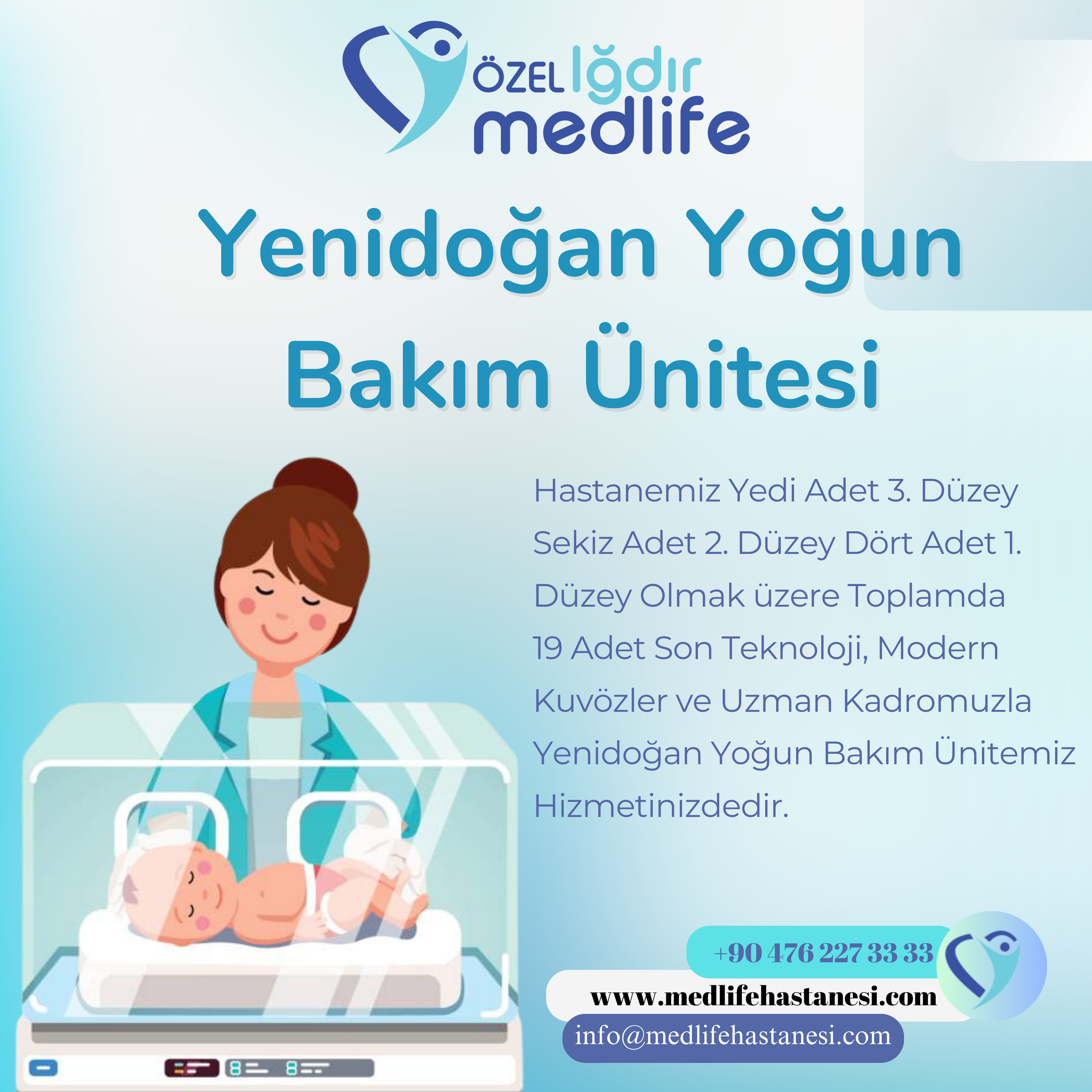 Hastanemiz Yedi Adet 3. Düzey Sekiz Adet 2. Düzey Dört Adet 1. Düzey Olmak üzere Toplamda 19 Adet Son Teknoloji, Modern Kuvözler ve Uzman Kadromuzla Yenidoğan Yoğun Bakım Ünitemiz Hizmetinizdedir.
